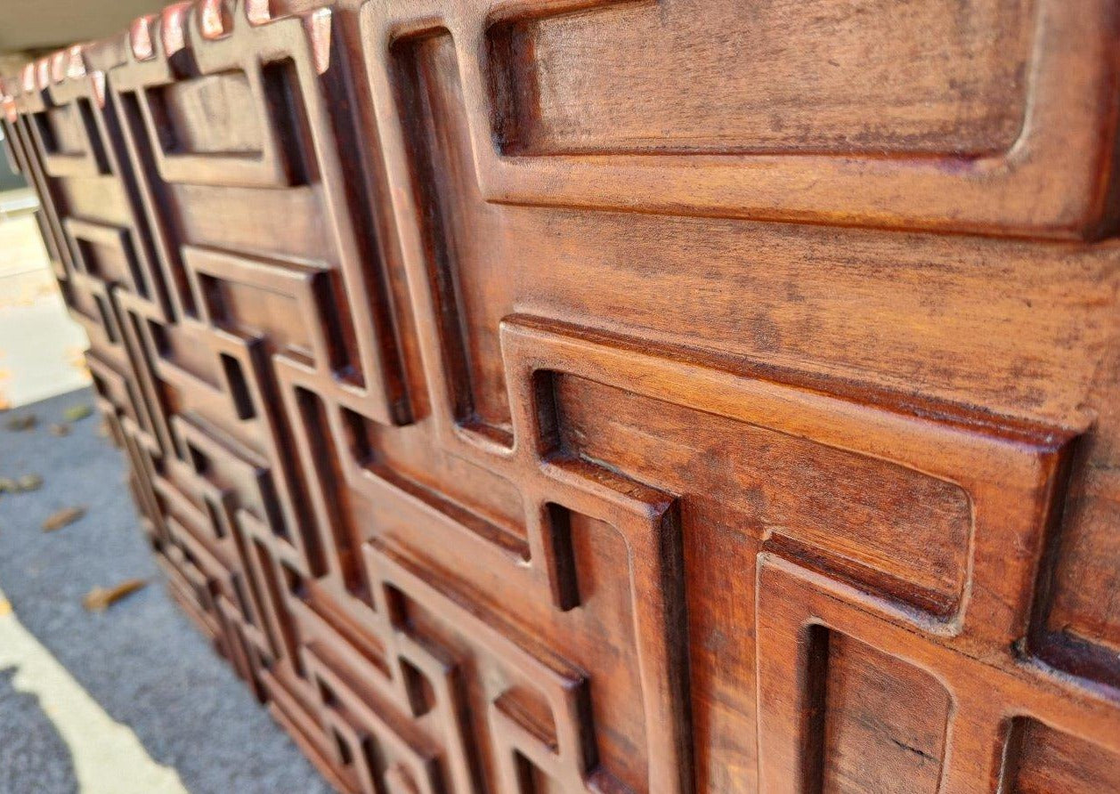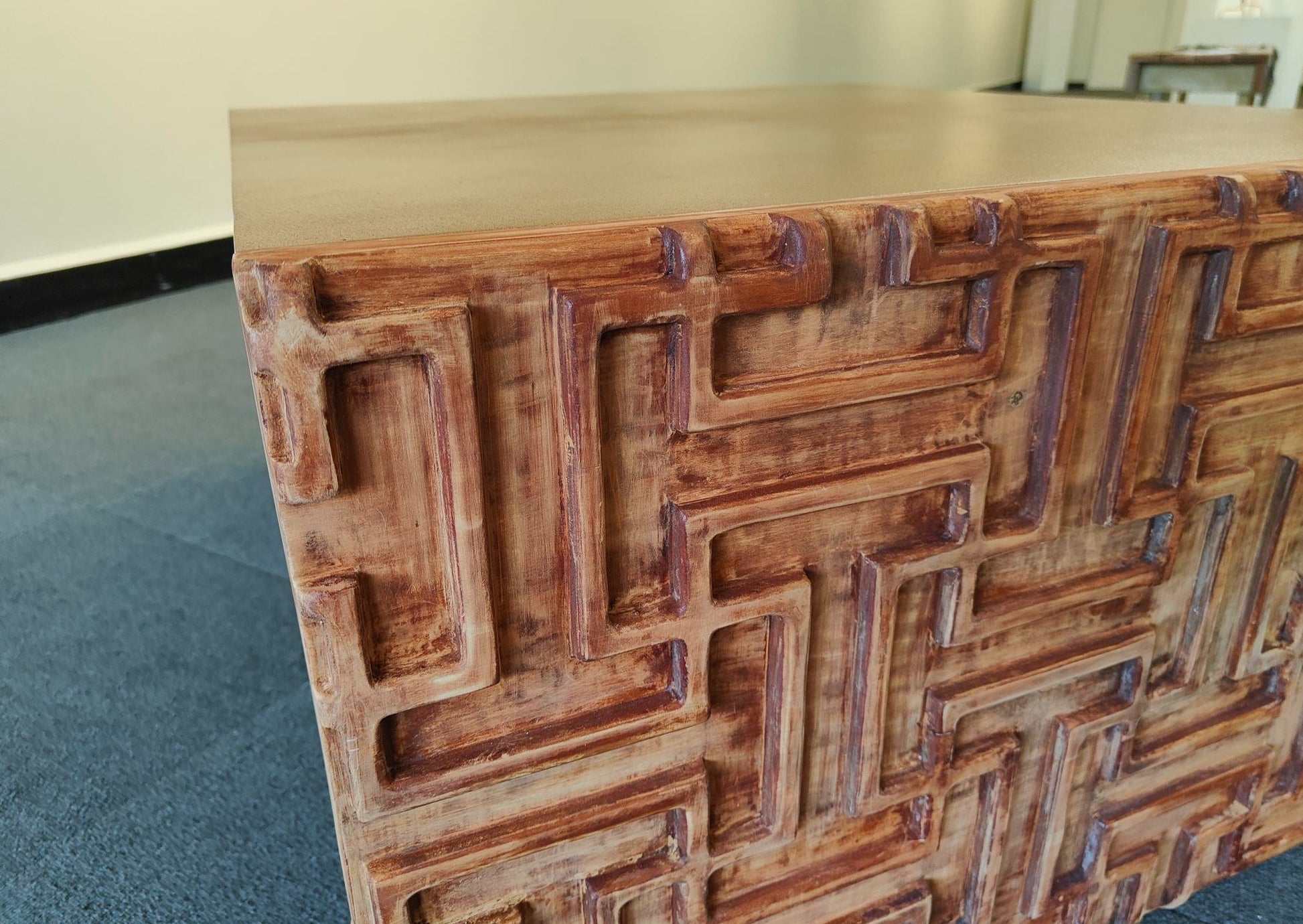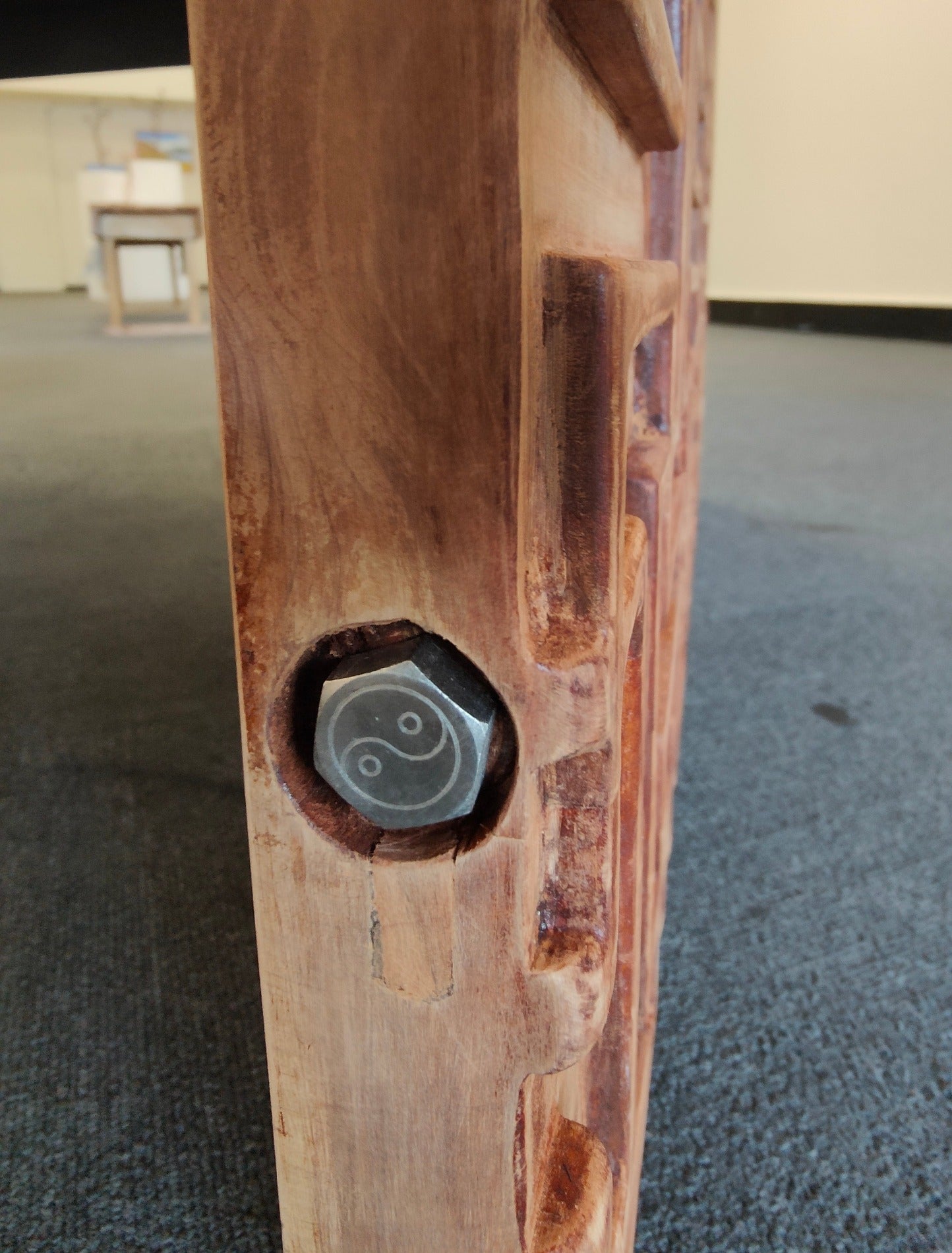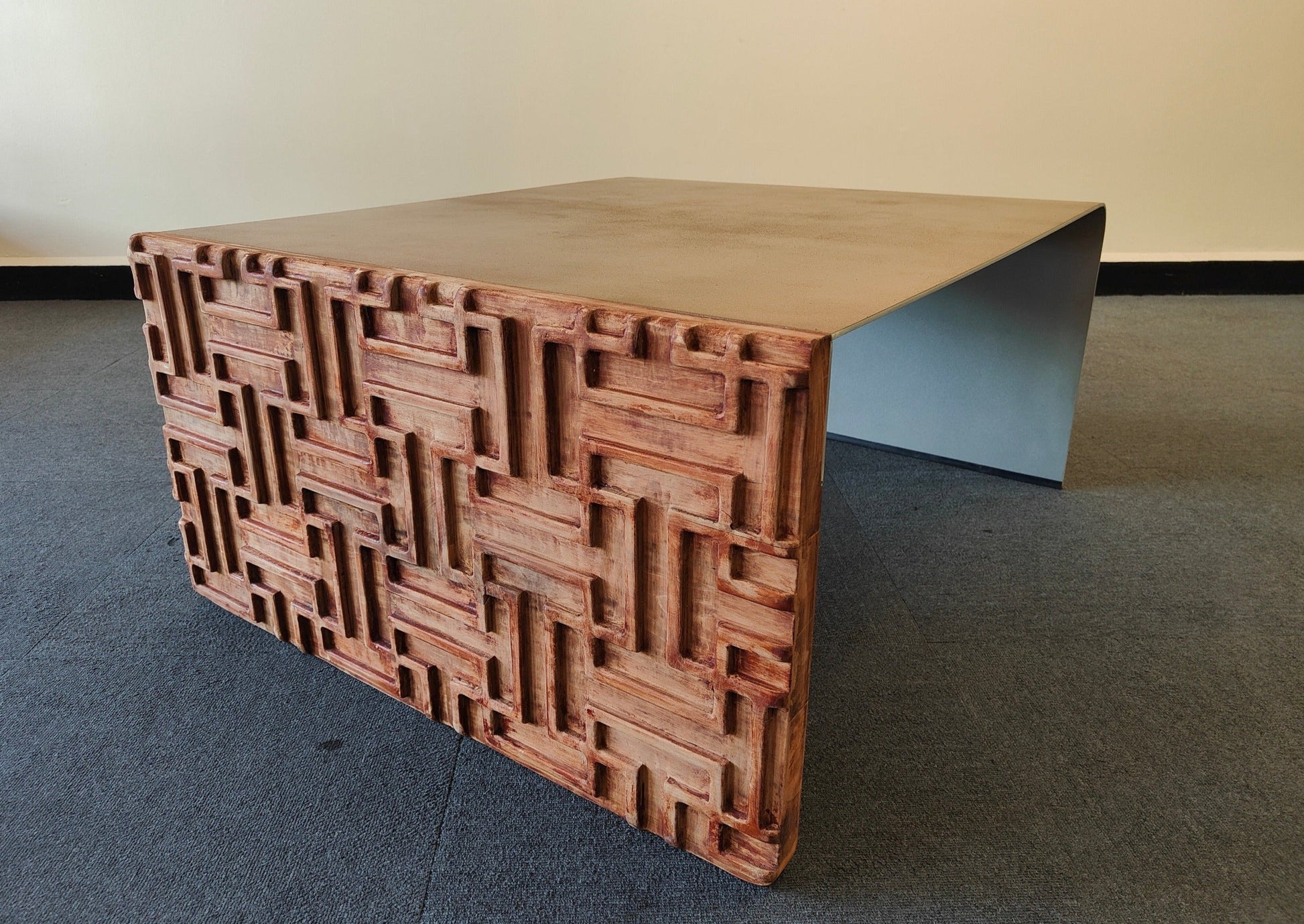 This table is # 4 in the Yin Yang series. The design is based on an architectural motif which is over a millennia old and thought to have originated in either China or Persia, being adopted more recently by Nazi Germany for the swastika. Carved with a router and then painstakingly hand sanded. Built out of aluminium which has been finished with copper paint and mottled Macrocarpa timber in a stressed paint finish. 970 x 790 x 430 high $2190 NZD